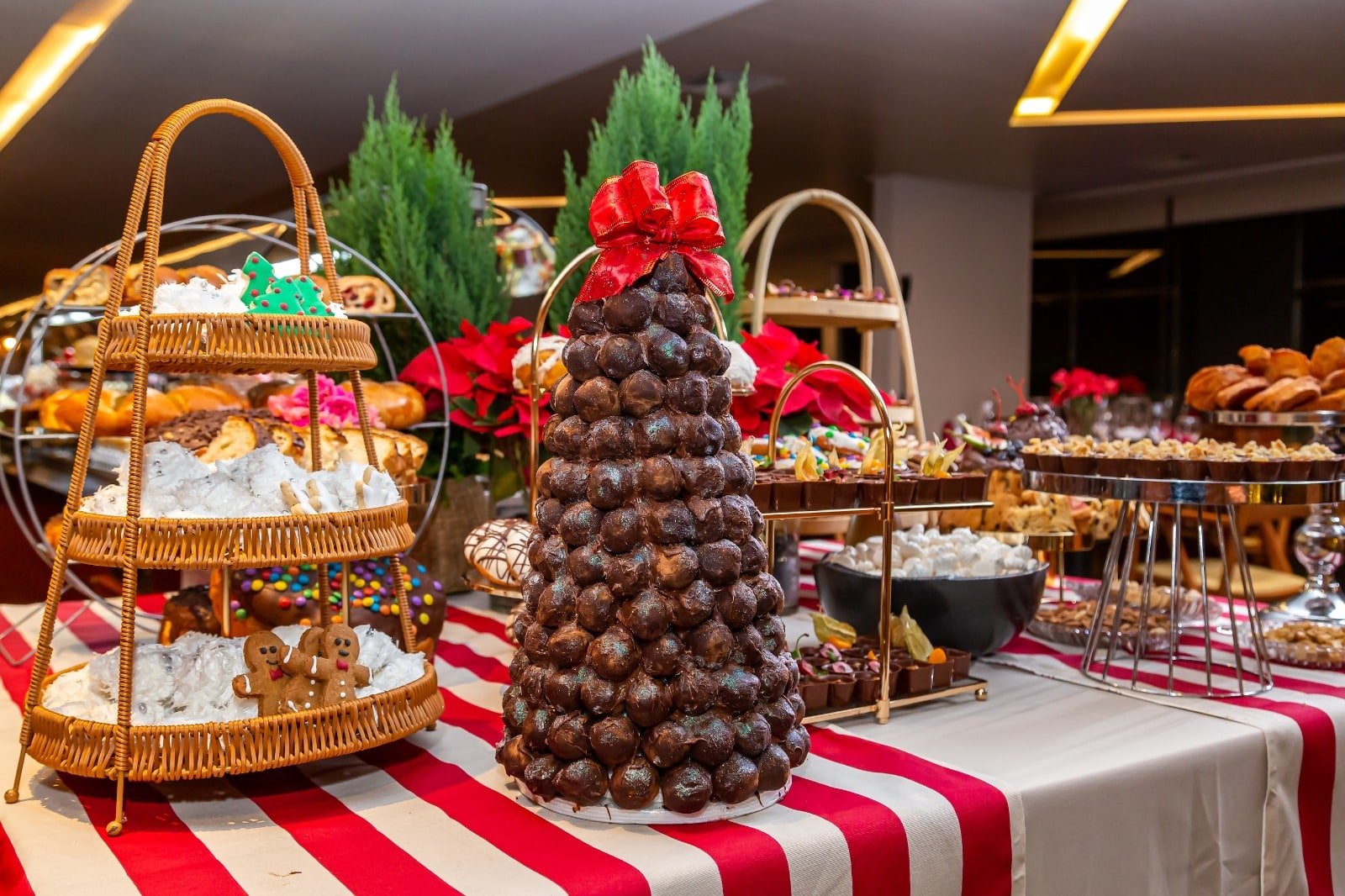 Entre as opções estão salada de bombom de gorgonzola com geleia de maracujá, burrata com tomate confit e cogumelos e salpicão de camarão defumado. Nos pratos principais, o cardápio inclui tender à Califórnia, chester, lombo de bacalhau confitado, roastbeef de filé ao roti e lasanha de vegetais com queijo vegano. Para a sobremesa, o buffet oferece cheesecake de limão com pistache, tortinha de nozes com caramelo salgado e torta argentina de doce de leite com chocolate belga.
